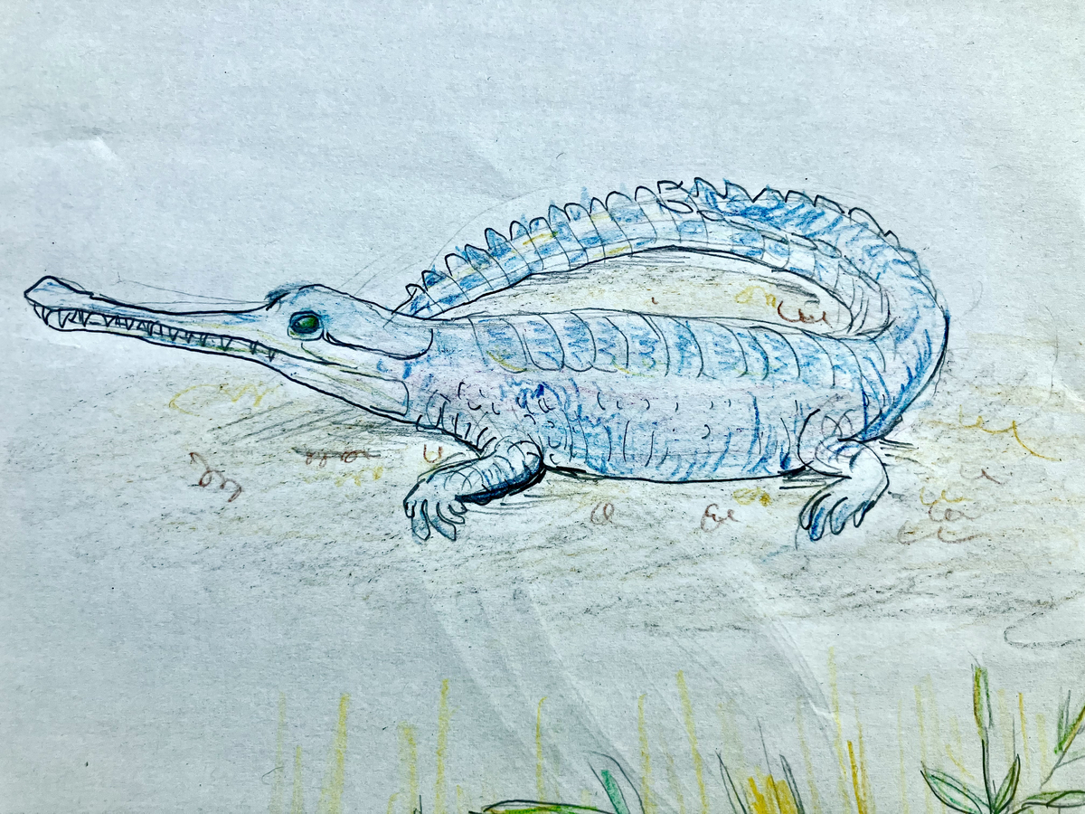 I slide my long, slender snout along the water’s surface and wake up on the riverbed in the morning, where sunlight filters through.